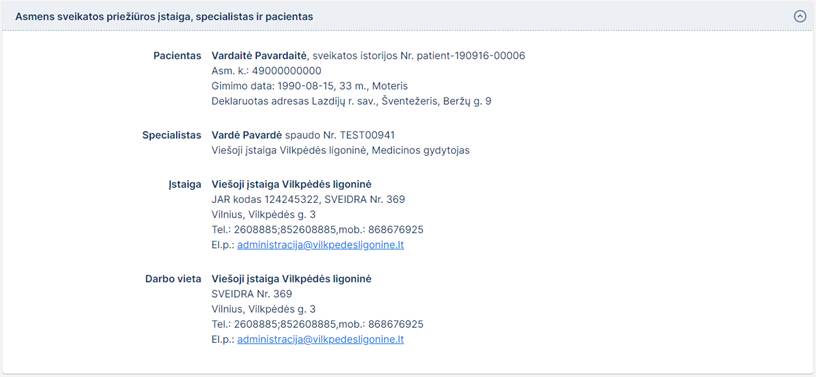1. Asmens sveikatos priežiūros įstaiga, specialistas ir pacientas. Bloke matoma informacija apie atvykimą registravusią sveikatos priežiūros įstaigą, prisijungusį specialistą, jo darbo vietą bei pacientą. Šie duomenys užpildomi automatiškai pagal prisijungusį naudotoją ir pasirinktą specialistą ir yra neredaguojami.