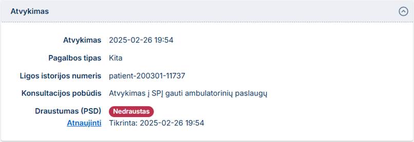 3. Atvykimas. Bloke matoma atvykimo informacija, kaip Atvykimo data ir laikas, pagalbos tipas, Ligos istorijos numeris, draustumas ir kita informacija susijusi su atvykimu.