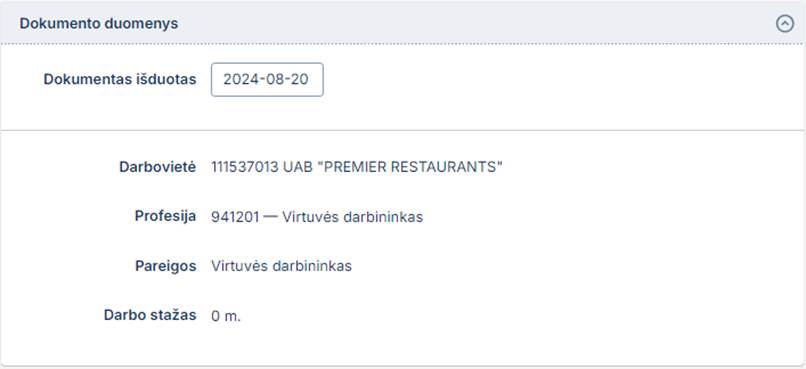 3. Dokumento duomenys, paciento darbovietė. Bloke nurodoma dokumento išdavimo data ir matomi paciento darbovietės duomenys, užpildomi automatiškai pagal darbdavio atstovo pildomą dalį ir neredaguojami.