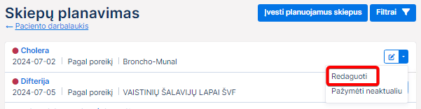 Pasirinkti redaguoti planuojamą skiepą galima: