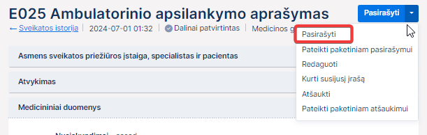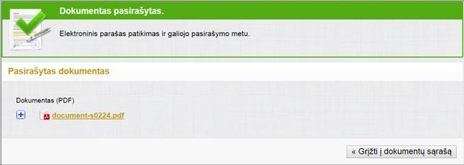 Šiame skyriuje aprašyta, kaip pasirašyti vieną dokumentą. Dokumentų paketo pasirašymas aprašytas skyriuje 4.19.1 Pasirašyti dokumentų paketą.