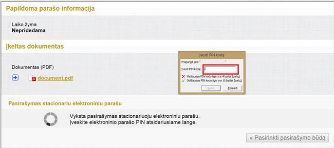 4. Įvesti el. parašo sertifikato PIN kodą. Įvedus PIN kodą, atliekamas dokumento pasirašymo veiksmas. PIN kodas įvedamas programinėje įrangoje, kuri skiriasi priklausomai nuo naudojamo pasirašymo sertifikato tipo. Sėkmingai įvykus siuntos elektroninio pasirašymo veiksmui, sistema atidaro langą, kuriame pateikia sėkmės pranešimą; lange yra nuoroda į pasirašyto dokumento .pdf formą, nuoroda į pasirašyto dokumento peržiūros langą.
