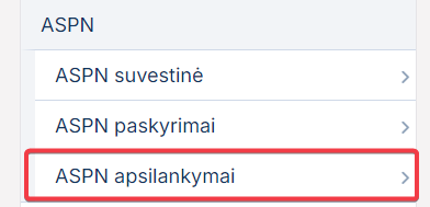 Naudotojas norėdamas peržiūrėti ASPN apsilankymus turi paspausti meniu punktą ASPN apsilankymai: