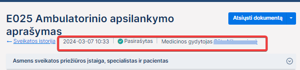 Šis veiksmas taip pat leidžiamas E003 ir E025 dokumentams, kurių būsena yra Pasirašytas ir nėra galimybių atšaukti dokumentą, bet yra reikalinga pašalinti iš Paciento ESI per klaidą su dokumentu pateiktą diagnozę ir/arba alergijos įrašą (plačiau skaityti skyriuje 4.20 Pakeisti elektroninį dokumentą).