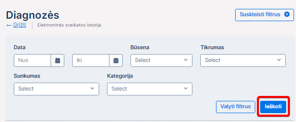 4. Rodomi paieškos rezultatai pagal įvestą užklausą. Norint vėl matyti visus diagnozių įrašus galima pasirinkti Išvalyti filtrus išskleidžiamame meniu.