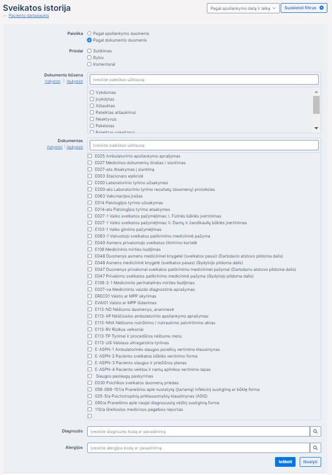 Atsidariusiame lange matomi visos paciento užregistruotos epikrizės: