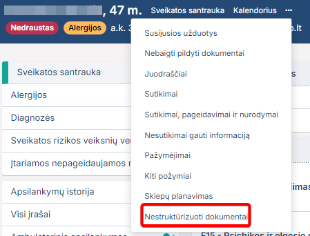susijusius nestruktūrizuotus dokumentus, viršutinėje paciento
