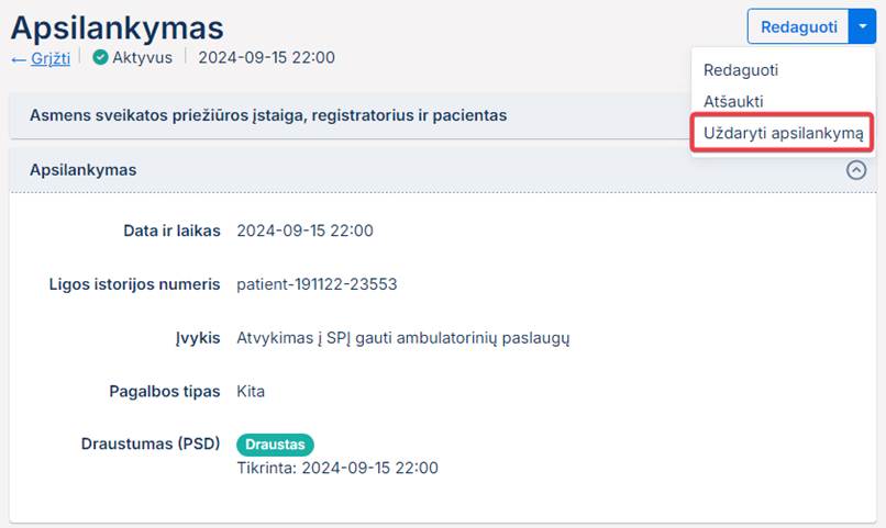 1. Pasirinkti Uždaryti apsilankymą. Iškviesti paciento apsilankymo uždarymo funkcionalumą galima šiais būdais:
