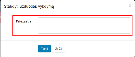 Pasirinkus Tęsti užduoties vykdymo sustabdymą, ESPBI IS atnaujina užduoties duomenis ir atnaujintą užduoties įrašą parodo užduočių sąraše (žr. skyrių 4.42.1 Peržiūrėti užduočių sąrašą).
