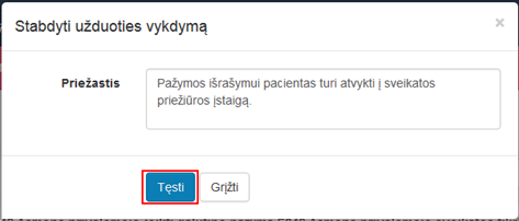 sustabdymą užduoties autoriui, vykdytojui ir pacientui, jeigu tai